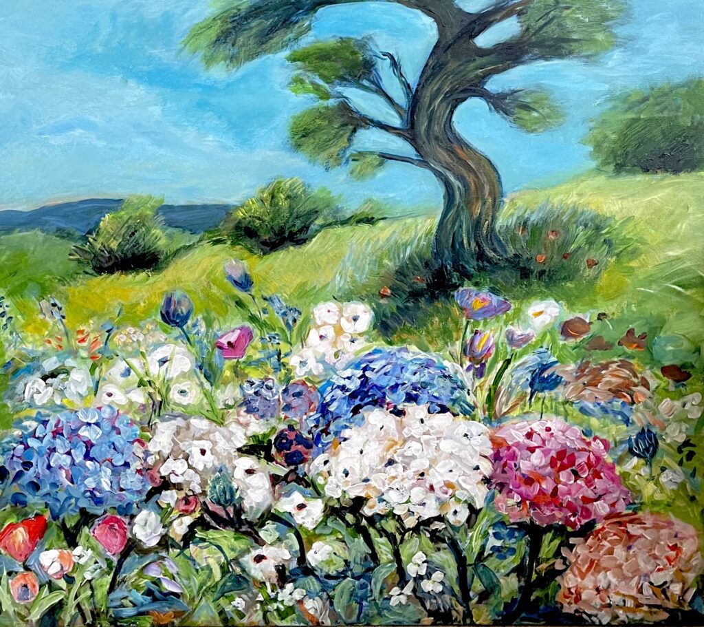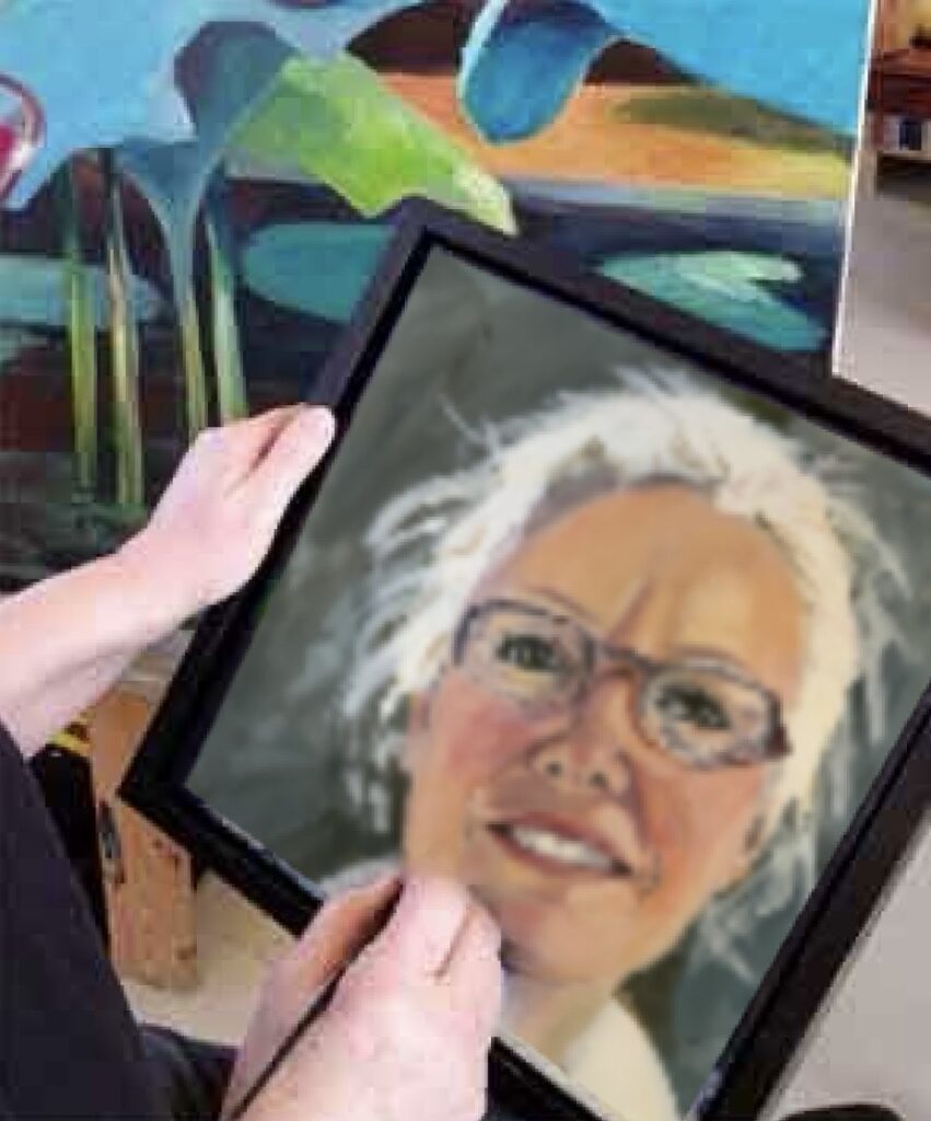 To malerier str 80×80 samlet til et som et maleri*“Hun lænede sig ind i billedet – og nu hænger hun på væggen hos Sabine. Tak for den smukke modtagelse!”
