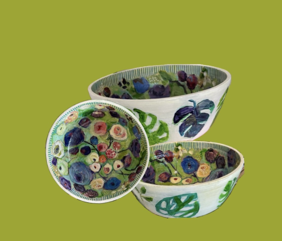 Håndmalede bambusfade og -skåle i unikke designs, Hver enkelt er bemalet med akryl og forseglet med lak.